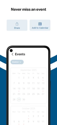 The event section shows a list of events throughout the district. Users can add an event to their calendar to share the event with friends and family with one tap.