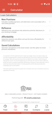 The calculations provided by the First Harrison Mortgage mobile app are useful in giving you an idea of what homeownership might mean for you. However, please be sure to contact your First Harrison Mortgage Loan Officer for a customized solution tailored to your specific financial situation, needs, and goals. Your Loan Officer can also assist you with any questions you have about your loan and the loan approval process.